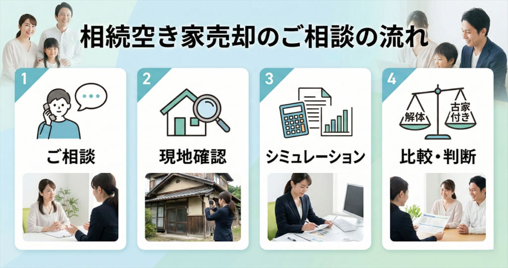 まだ売却を迷っている段階で構いません。相続・空き家のご相談を数多くお受けしてきた地元専門家が、今の状況をわかりやすく整理いたします。